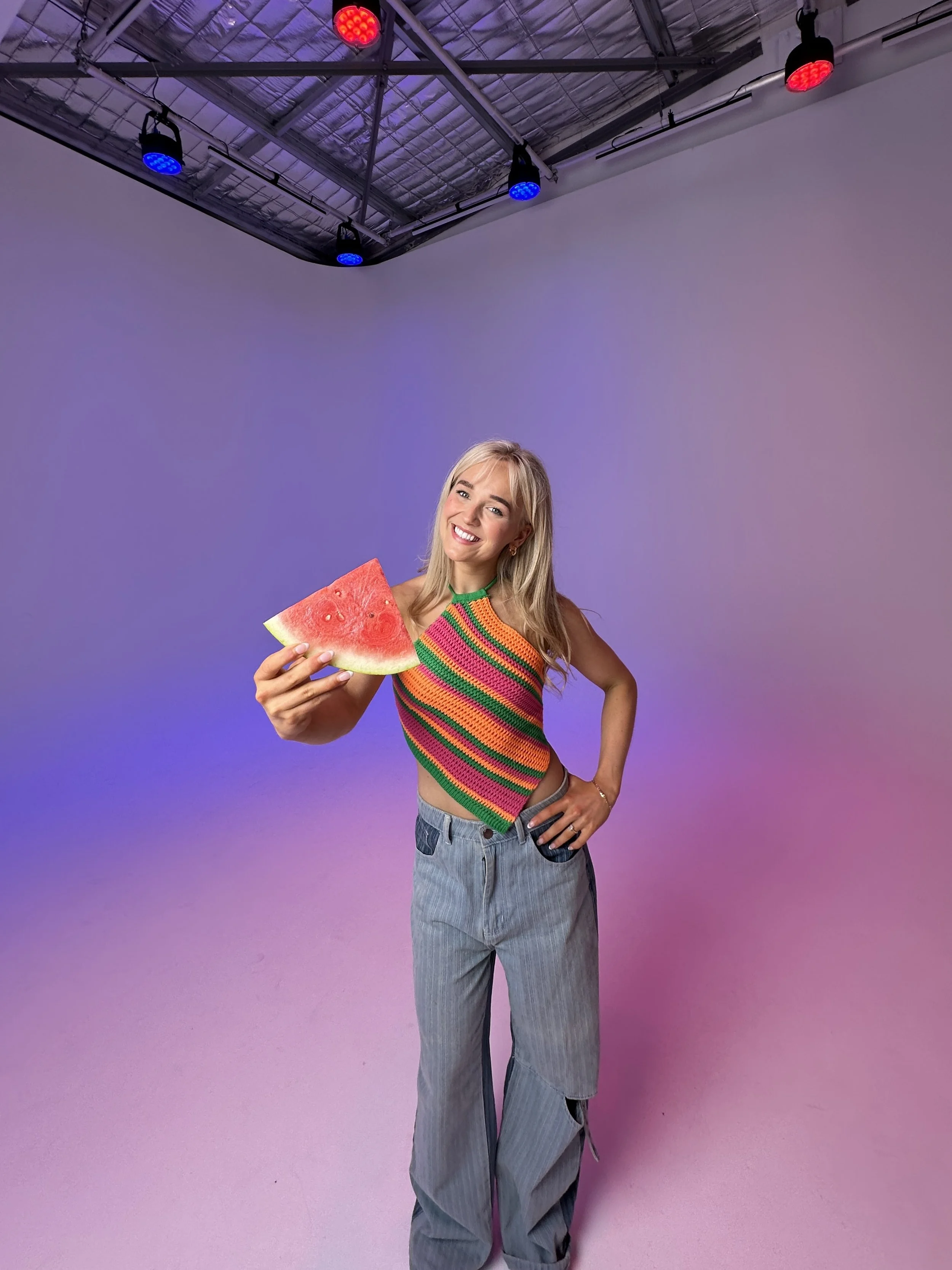A young woman with long blonde hair smiling and holding a slice of watermelon in a colorful studio with pink and purple gradient floor and a plain wall. Overhead stage lights are visible from the ceiling.