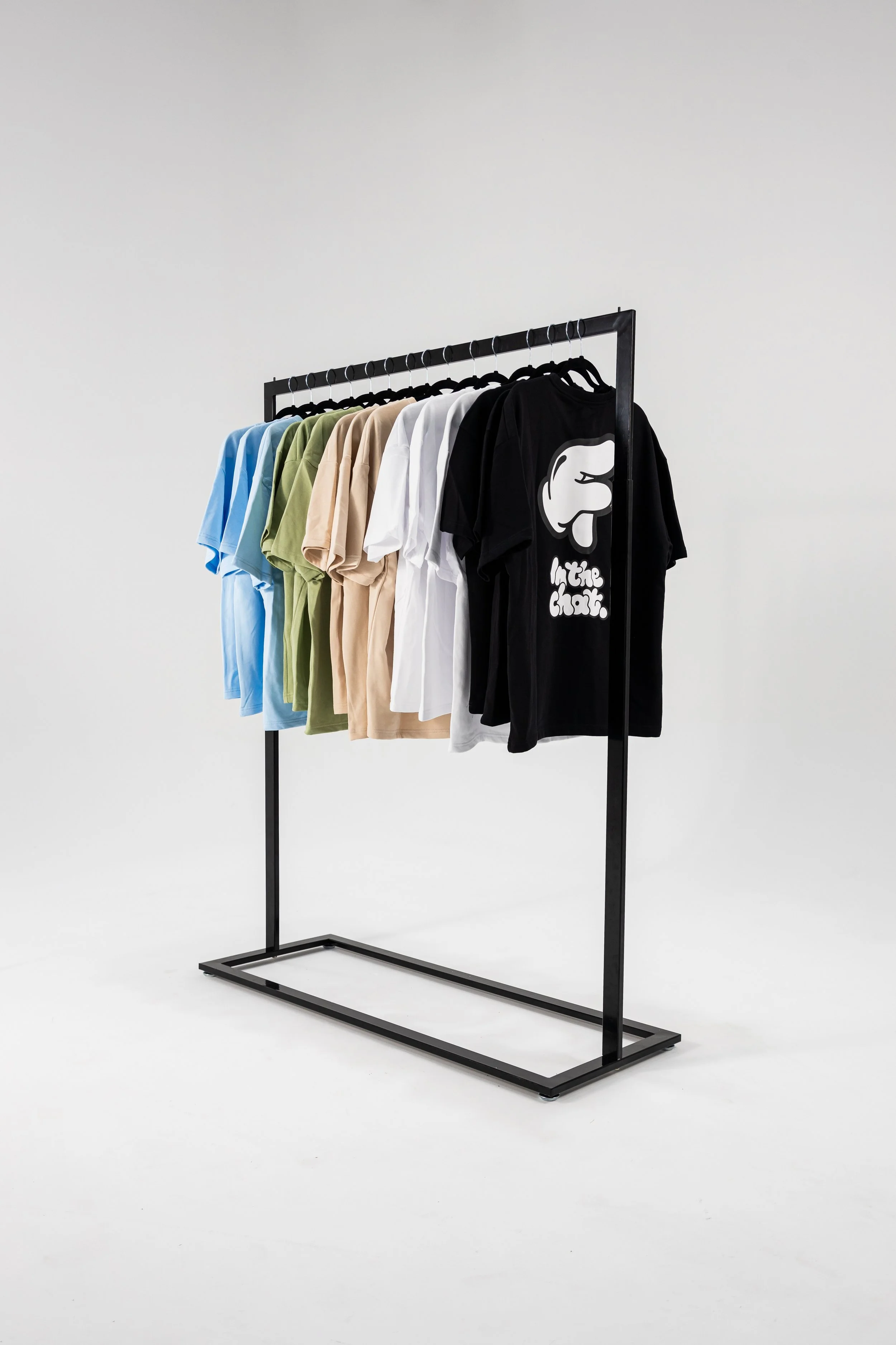 A black clothing rack displaying seven colorful T-shirts in light blue, green, beige, white, black with a graphic, and white against a plain white background.